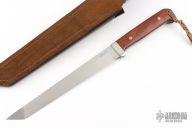 Semi Mirror Polished, Hair Lined Finished, 8’ Solid ATS-34 Stainless Steel Tanto Katana Style Blade. A Sturdy 5 inch Rosewood handle with Stainless Steel Hilt. This Custom Handmade Handle has Good Weight Balance, Strength and Durability. Designed to meet the needs of serious hunters, the handle is nicely hand contoured to provide a secure, comfortable grip.
