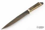 The Rasp Knife by Mick Strider features a black blade with sharpened top edge, .233" Blade Stock and 1.137" Blade Depth, full tang construction with pinned fossil mammoth ivory slabs. Rifle butt style pommel with lanyard hole. Comes in a Strider velcro pouch. Has some patina, couple of light cracks in the handle material. Excellent condition.