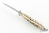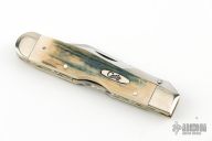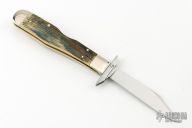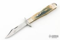 This D/A Auto Conversion Cheetah lock back folder from Case Knives features a clip point mirror polished blade with nail nick and fileworked spine. The handle has nickel silver bolsters, front and rear, and swing guard, and the scales are blue/cream mammoth ivory over brass liners, fileworked stainless steel backspacer. Has some light staining on the blade, otherwise excellent condition. The pictures make the stain look worse than it does in person. Comes with original box. Tank only made 3 of these Case Cheetah conversions with the Cheetah banner on the blade and Mammoth Ivory. RARE.
