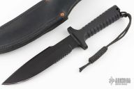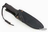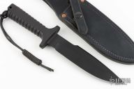 This RPW X-46 fixed blade has a black coated spear point blade with a thickness of 1/4" and  1 1/2" blade depth. The top portion of the blade has a false edge. This knife is constructed from a solid piece of steel and has a very solid feel. Comes with a black leather sheath with copper rivets. Has some scuffs and minor wear on the finish, otherwise excellent condition. Has been lightly used.