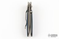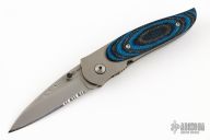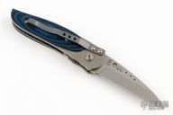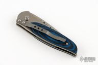 This Viele Wasp by Columbia River Knife and Tool is a Howard Viele design, it features black/blue G-10 scales over a bead blasted titanium frame . Single thumb stud with rubber inlay. Strong lock up, nice detent and blade seating is dead center. Comes with original box and papers. Excellent condition.