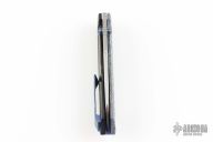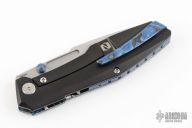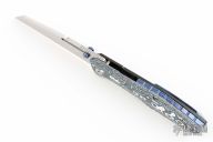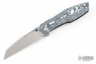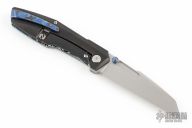 This Raikou by Null Knives features a hand rub satin finished blade with notched thumbrest and dual titanium thumbstuds. The handle has a blue/white scale with black titanium frame with satin titanium hardware and DarkTi tip up clip. Comes with original box and papers. Excellent condition. #36/50