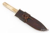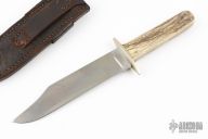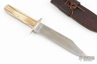 This Bowie by JP Miller features a hand rub satin finished blade with .244" blade stock and 1.429" blade depth, full tapered tang construction. The handle has nickel silver guard, elk antler scales with nickel silver pins. Comes with a brown leather sheath and a zippered case. Has some scratches and patina, otherwise good condition.