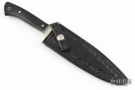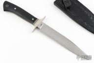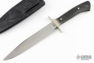 This Fighter by Master Smith Jim Walker features a clip point hand rub satin finished blade with a false top edge, .189" blade stock and 1.167" blade depth, hidden tang construction. The handle has nickel silver guard, black linen micarta grip with black/nickel silver spacers. Comes with a hand tooled black leather sheath by Rowe's Leather. Has a couple light scratches and a couple very light oxidation spots, otherwise excellent condition.