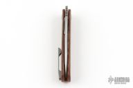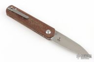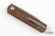 This Feist from Kizer was designed by Justin Lundquist. It features a stonewashed blade with front flipper. The handle is comprised of brown canvas micarta with a beadblast titanium tip up clip. Excellent condition.