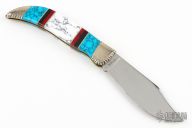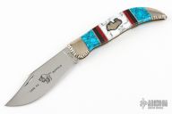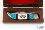 This slipjoint from Case Knives features a clip point mirror finished blade with nail nick. The handle has fileworked nickel silver bolsters, turquoise/black/jasper/white turquoise with nickel silver buffalo inlay, brass liners and stainless steel spring. Includes original wooden box. Excellent condition. #2 of 25