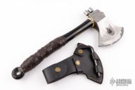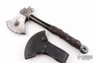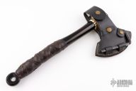 This Axe by Ema Forge features a VG-10 Damascus axe head with two Damascus screws that attach it to the black anodized titanium handle with leather wrap. Comes with a black leather sheath with a slot for the wrench to remove the screws and head. New from maker.