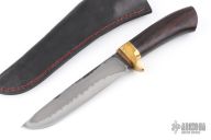 This Hunter by Last Knives features a hand rub satin finished blade with a nice hamon and forge finished flats, .196" blade stock and 1.195" blade depth, hidden tang construction. The handle has a copper and brass guard and a rosewood grip. Comes with a black leather sheath and COA. New from maker.