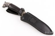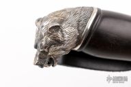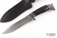 This knife from Nord Crown features a Damascus spear point blade with fullers and false top edge, .190" blade stock and 1.491" blade depth, hidden tang construction. The handle has a silver guard and butt with a bear's head, with an ebony wood grip that has been carved. Comes with a black leather sheath and original box and papers. Has a couple spots on the blade, excellent condition otherwise.