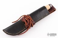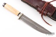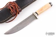This Fighter by Journeyman Smith Rob Patton features a straight back Damascus blade with, .195" blade stock and 1.242" blade depth, hidden tang construction. The handle has a nickel silver guard and a mammoth ivory grip with Damascus butt cap. Comes with a brown/black leather sheath. Has some rusting on the blade, and some scuffs and scratches, otherwise great condition.