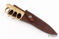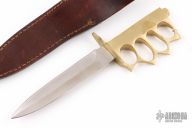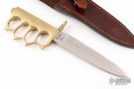 This 1918 Trench Knife Reproduction by Ron Smith features a double edged blade with .170" blade stock and 1.147" blade depth, hidden tang construction. The handle is comprised of brass over hidden tang construction. Glass breaker on pommel. Includes leather sheath with belt loop. The blade has a slight bend in it.  Has some scratches and patina, otherwise good condition.