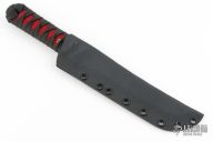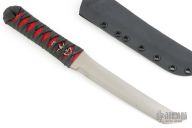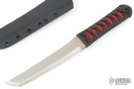 This Tanto by Pohan Leu features a satin finished scandi ground blade with .123" blade thickness and 1.168" blade depth. Japanese style wrap with black cord over red stingray skin with scorpion menuki. Comes with Kydex sheath. Excellent condition.
