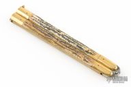 This balisong from the Philippines features a drop point blade with a satin finish. The handle has brass bolsters, front and rear and jigged bone scales, brass T-latch. Has a couple light scratches and patina, otherwise excellent condition.
