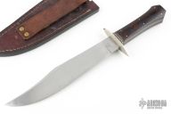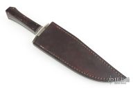 This Bowie by Master Smith Henry Torres features a hand rub satin finished blade clip point blade with a false top edge, hidden tang construction with .2" blade stock and 1.652" blade depth. The handle features a nickel silver guard, fileworked nickel silver collar and liners, ironwood grip. Comes with a brown leather sheath. Has rust, and spots on the blade. Great condition otherwise.