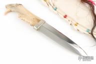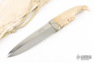 This dagger by Walt Kneubuhler features a hand rub satin polish finished blade with .256" blade stock and 1.599" blade depth, hidden tang construction. The handle has a nickel silver guard, jaw bone grip. Comes with a sheath. Has some light scratches, otherwise excellent condition.