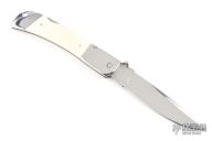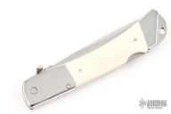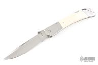 This lockback by Zollan McCarty features a satin polished blade with integral thumb tabs. The handle has polished dovetailed stainless steel bolsters, mammoth ivory scales, stainless steel liners and backspacer. Nice lockup. Has some light scratches, otherwise excellent condition.