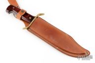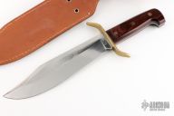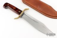 This W49 Bowie by Western Cutlery features a bowie blade with a false top edge, .168" blade stock and 2.123" blade depth, full tang construction. The handle has a brass s-guard, wood scales with brass pins. Comes with a brown leather sheath. Has some light scratches and patina, excellent condition.