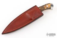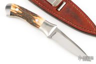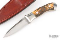 This Boot Knife from Mr. Pease features a mirror finished blade with a false top edge, .200" blade stock and .873" blade depth, full tang construction. The handle has stainless steel bolsters, stag scales with mother of pearl pins. Comes with a brown leather sheath with boot clip. Excellent condition. "R28m6" on blade.