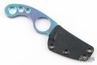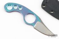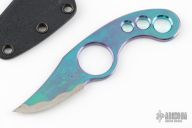 This La Griffe is a Fred Perrin design that has been executed by Tom Krein, it is made of anodized titanium with a chisel ground blade with a carbide edge, .189" thickness and 1.086" blade depth, 1" diameter finger hole. Nice fit in the hand. Has some light scratches/scuffs, otherwise excellent condition. Comes with kydex neck sheath.