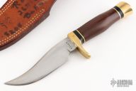 This skinner from G.W. Stone features a satin finished blade with .238" blade stock and 1.334" blade depth, hidden tang construction. The handle has a brass guard and butt with lanyard hole, and a red/brown linen micarta grip with black and brass spacers. Stamped "SC135". Has some scratches, has been sharpened, otherwise good condition. Comes with a hand tooled brown leather sheath.