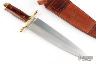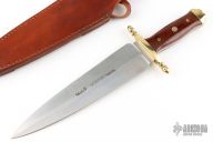 This Montero by Muela Knives feaures a satin finished double edged blade, .160" blade stock and 2.173" blade depth, full tang construction. The handle has a brass guard and butt with wood scales (ironwood?). Comes with brown leather sheath, original box and papers. Excellent condition.