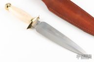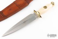 This Brama Special Edition by Muela Knives feaures a satin finished double edged blade, .160" blade stock and 1.790" blade depth, hidden tang construction. The handle has a brass guard and butt with a faux ivory grip. Comes with brown leather sheath, original box and papers. Excellent condition.