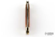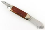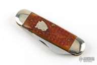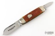 This slipjoint by Winchester features mirror polished blades with nail nicks. The handle has nickel silver bolsters, burnt orange jigged bone covers with a Buffalo Horn escutcheon, brass liners and a steel springs. Comes with original box.  Excellent Condition.