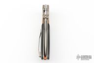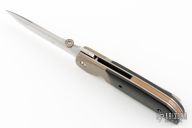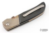 This Athena by Bob Terzuola features a tumble finished and mirror polished blade with notched thumbrest and a super conductor thumbdisc. The handle has super conductor bolsters, carbon fiber scales, orange peel finished titanium liners, copper backspacer, tip up titanium clip with hidden screws. Nice detent, lockup, blade seating. Excellent condition.