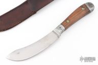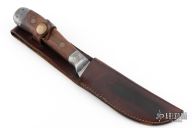 This 1940's skinner by F.J. Richtig features an upswept satin finished blade, .069" blade stock and 1.236" blade depth, full tang construction. The handle has dovetailed aluminum boslters with wood scales. Comes with a brown leather sheath. Has some scratches and patina, otherwise good condition for its age!