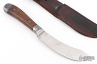 Frank Richtig made knives for about 50 years from the 1930's to the 1970's. He was born in Nebraska in 1887, and became an apprentice blacksmith in 1905, and in 1916 began experimenting with electric heat treating of steel. in 1925 he started producing knives. He produced many styles of cast aluminum handled kitchen knives as well as aluminum and regular handled hunting knives. His main credit would be in his secret tempering method. Where ever he'd set up his wares he'd bring an anvil along and proceed to cut a piece of metal in two and still retain an edge sharp enough to shred paper. In 1936 Frank Richtig appeared in Ripley’s Believe It or Not after using one of his knives to cut the lock from a jail cell. Richtig’s claim to fame, so to speak, was in his blades. Having the proper amount of hardness to cut through steel and iron, and yet be able to maintain a fine cutting edge. It is said that Richtig’s method of treating the steel, a closely guarded secret while he was alive, is is something he took to the grave with him. One of his other unique features was his cast aluminum handles. In 1938 he was declared a Master Ironsmith by the National Blacksmith and Welders Association. Frank passed away in 1977.