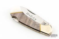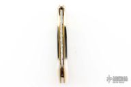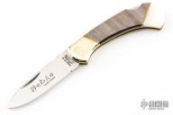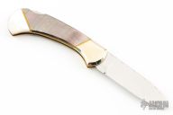 This lockback by Parker has a mirror finished blade with nail nick and fileworked spine. Nickel silver bolsters, black lip pearl and mother of pearl scales with a brass spacer, brass liners, fileworked stainless steel spring. Has a couple light scratches, otherwise excellent condition.