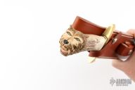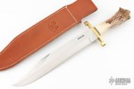 This Model 12-11 Confederate Bowie by Randall Made Knives features a satin finished carbon steel blade with sharpened top edge, .214" blade stock and 1.708" blade depth, hidden tang construction. The handle has a lugged brass guard, stag grip, black/brass spacers, "Sabertooth" carved butt cap by Paul G Gussenmeyer. Comes with a brown leather sheath. Has a couple light scratches, otherwise excellent condition. Comes with a zippered case.