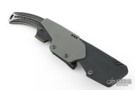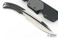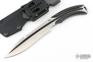 This Tiburon by Todd Begg Designs features a satin finished blade with a false top edge and a groove through the middle of the blade and handle with holes drilled through, .263" blade stock and 1.500" blade depth, integral construction with carbon fiber inlays Notches on thumbrest for more secure grip and 4 individual carbon fiber scales. Great feel in hand. Includes a black kydex sheath. Excellent condition.