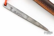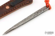 Hand forged by Ryan Johnson at the Gold Point Forge! The Thistle from Ryan is a handy small and discreet EDC companion, that is light enough to carry all day while still being substanial and easy to use. The shaft features a catacombs motif that adds a killer look while also providing a bit of extra traction. The triangular needle like point is perfect for when you need to mark, pry or poke a hole in somthin'! Added cordage on the back to aid in ease of deployment. Comes with a custom leather sheath with IWB clip and finished with Ryan's homemade dye concoction. Note: Each is hand made start to finish. There might be slight differences in dimensions and patterns. Just know yours is unique!