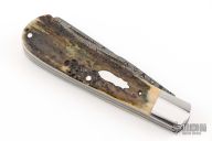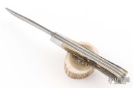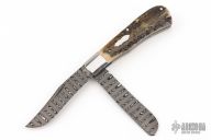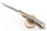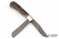 This Two-Blade Tapper by Bill Ruple features Damascus blades with nail nicks. The handle has stainless steel bolsters, mammoth ivory covers with a stainless steel escutcheon, stainless steel liners, Damascus springs. Has half-stops, flush in all positions. Comes with a zippered case. Brand New!