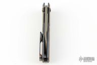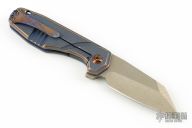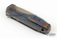 This Silvera by Jason Stout features a bronzed chisel ground wharncliffe blade with fullers and flipper tab. The handle has a milled, anodized, and tumbled titanium frame with a matching titanium tip up clip. Barrel spacers, and anodized titanium pivot. Comes with a cloth rollup and COA dated 6/2/23. Nice detent, lockup and blade seating. Excellent condition.