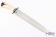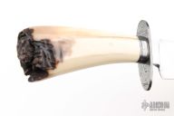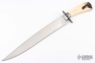 This Bowie by Master Smith Don Hanson III features a hand rub satin finished blade with nice hamon, .231" blade stock and 1.682" blade depth, hidden tang construction. The handle has a Damascus guard and fluted collar, beautiful walrus ivory grip with a single pin. Comes with a zippered case. Has some light spots on the blade, otherwise excellent condition. Really a stunning piece.