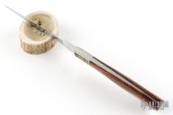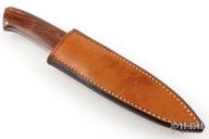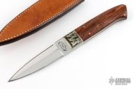 This Boot Dagger by Gordon Chard features a mirror polished double edged blade with .177" blade stock and .971" blade depth, full tapered tang construction. The handle has engraved nickel silver bolsters with wood scales. Comes with a brown leather boot sheath and a zippered case. Excellent condition.