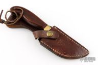 This knife by Olsen Knives features a satin finished blade with .186" blade stock and 1.442" blade depth, full tang construction. The handle has a brass guard and rosewood scales. Comes with a brown leather sheath. Has some scratches and pitting, has been resharpened, otherwise good condition.