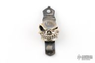 Dress up your Strider knife with this triple collaboration pocket clip from Steel Flame and Starlingear! Flame patinad pocket clip with a brass slickster sitting on top featuring a patina'd finish with polished highlights and measuring about .990 inches tall by .865 inches wide. New condition.