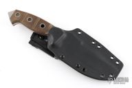 This Subversive by Shane Sibert features a satin finished blade with a sharpened top edge and notched thumbrest, .189" blade stock and 1.470" blade depth, full tang construction. The handle has brown canvas micarta scales with red liners. Extended skull crusher. Comes with kydex sheath, COA and a zippered case. Excellent condition.