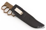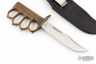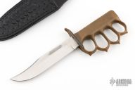 This Model 119 by Buck Knives features a satin finished clip point blade with false top edge and fullers, .180" blade stock and 1.075" blade depth, hidden tang construction. The tang has been modified to fit a cast 1918 trench knife handle with the guards filed/ground off. Comes with a hand tooled leather sheath. Has some scuffs and scratches, good condition otherwise.