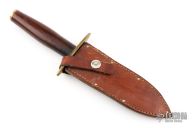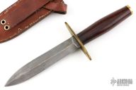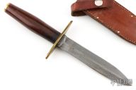 This dagger by Dickson Knives features a double edged Damascus blade with .253" blade stock and 1.039" blade depth, hidden tang construction. The handle has a brass guard and butt with a cocobolo grip. Comes with a brown leather sheath. Has some light scratches and patina, otherwise good condition.