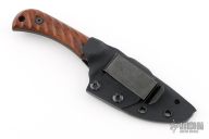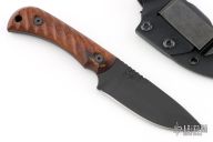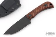 This Cav Jr by Half Face Blades features a black cerakote finished blade with a textured blade spine, .149" blade stock, 1.248" blade depth, full tang construction.  The handle has desert ironwood scales with lanyard hole. Comes with a kydex sheath with clip. Has a couple light sheath scuffs, excellent condition otherwise.