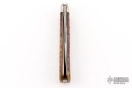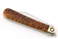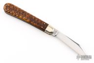 This vintage auto by Press Button Knife Co features a clip point blade, nickel silver bolsters, jigged bone scales, steel liners and backspacer. Has some light scratches, has some blade play, otherwise good condition and function for its age.
