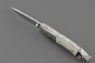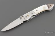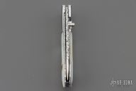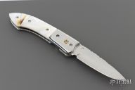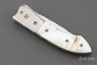 This linerlock by OH Design features a mirror finished blade with single thumb stud and a fileworked spine. The handle has stainless steel bolsters, fluted mother of pearl and black lip pearl scales, fileworked stainless steel liners and backspacer. Nice detent, lockup and blade seating. Excellent condition.