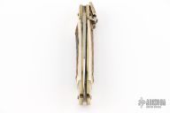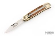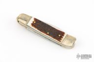 This Lever Lock Automatic by Hubertus Knives features a polished clip point blade. The handle is comprised of nickel silver bolsters and lever with stag scales over brass liners and steel backspacer. Has some light scratches, otherwise excellent condition.