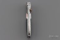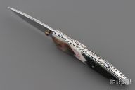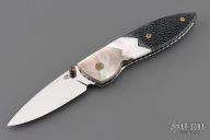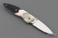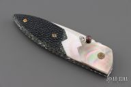 This knife by TS Knife features a mirror polished blade with a single brass thumbstud with purple stone inlay and fileworked spine. The handle has black lip pearl bolsters, mother of pearl and stingray skin scales, mosaic pivot and gold plated screws, fileworked stainless steel liners and backspacer. Nice detent, blade seating and lockup. Excellent condition.