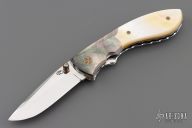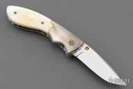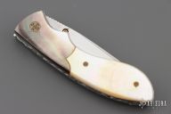 This knife by TS Knife features a mirror polished blade with a single brass thumbstud with light blue stone inlay and fileworked spine. The handle has black lip pearl bolsters, gold lip pearl scales, mosaic pins, fileworked stainless steel liners and backspacer. Nice detent, blade seating and lockup. Excellent condition.