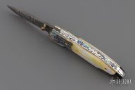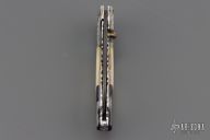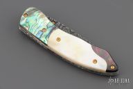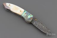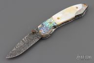 This knife by TS Knife features a Damascus blade with a single brass thumbstud with red stone inlay. The handle has abalone bolsters, gold and black lip pearl scales, gold plated screws, fileworked stainless steel liners and backspacer with abalone inlays. Nice detent, blade seating and lockup. Excellent condition.
